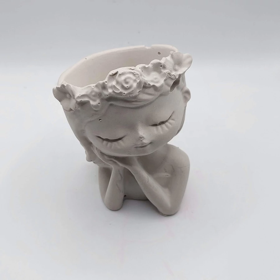 A gipsz öntvény alapanyag impregnálás után vízállóvá válik, így kültéri kiegészítő kellékként is megállja a helyét. Akril festékkel könnyen festhető, az arcot, a koszorút kifestve igazán egyedivé varázsolhatjuk ezt a kedves kis kaspót.